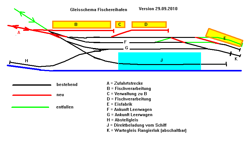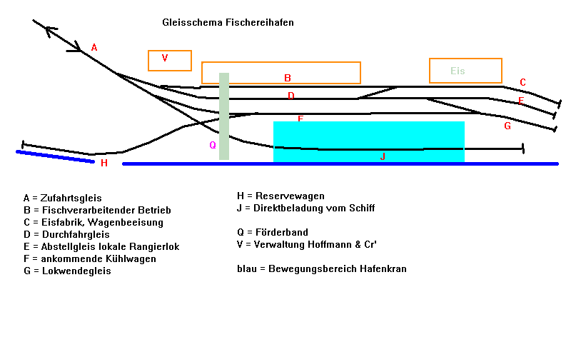 Schema der Gleisanlagen Südseite. Die Buchstaben bedeuten das gleiche wie in der Zeichnung gestern - bei C zum neuen zusätzlichen Betrieb von Egon Eggers, bei E zur Eisfabrik, bei J zum Gleis am Kai. Bei A geht es in die große weite Welt