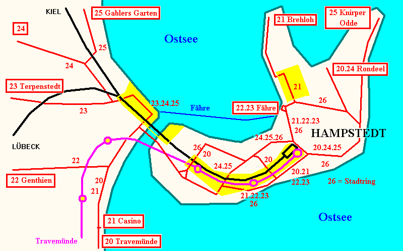 Jeder hat wohl seine Modellbahnanlage gedanklich mehr oder minder konkret irgendwo im realen Raum angesiedelt und die Experten sich dann auch einen realen Bahnhof zum Vorbild genommen. Mein Vorbild ist fiktiv. Angesiedelt ist die Stadt Hampstedt ein paar Kilometer nördlich von Travemünde auf einer der Ostsee-Küste vorgelagerten Insel. Die Lübecker haben das Eiland schon zur Hansezeit von den Holsteiner Grafen als Pfand für geliehenes Geld in den Händen gehabt. Daher haben die Buslinien dort auch die 20-er Nummern, denn früher gab es auch in Lübeck nicht so hohe Liniennummern für Straßenbahn und Bus.
