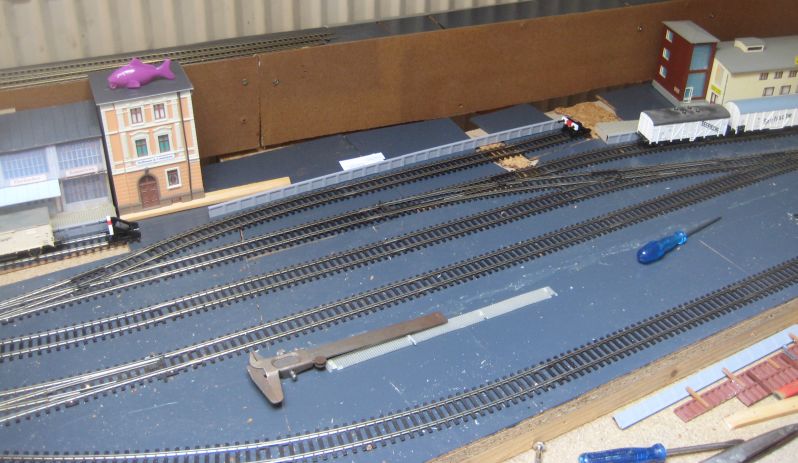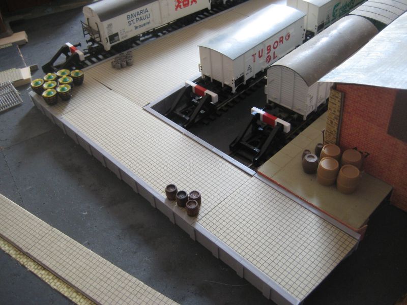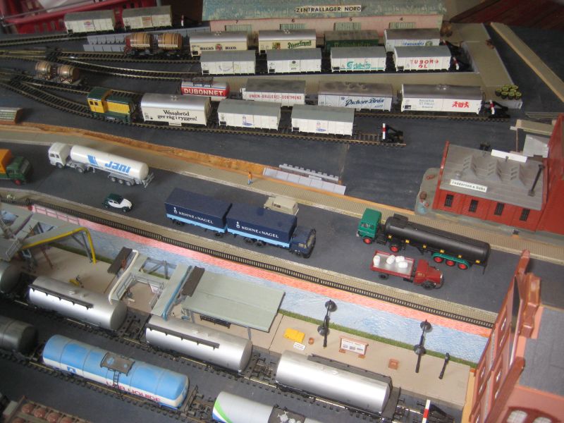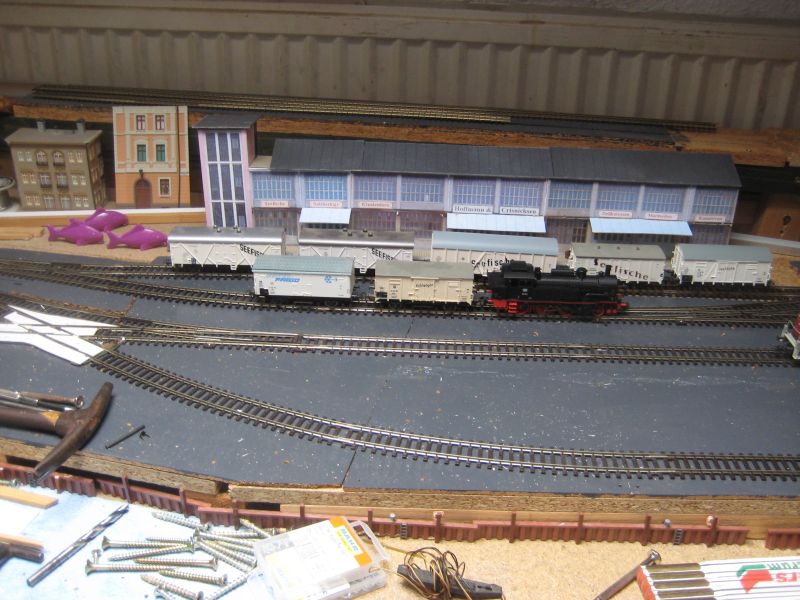 Es tat sich wieder was im Fischereihafen. Die Gleisanlage ist jetzt festgelegt. Obwohl zumeist das Fischverarbeitungsgebäude ziemlich direkt am Kai steht, habe ich es mehr nach hinten gesetzt, weil sonst eben die meisten Gleise hinter diesem Gebäude wären. Daher führt dorthin ein Förderband. Rangierlok wird wohl die "74" von Trix.