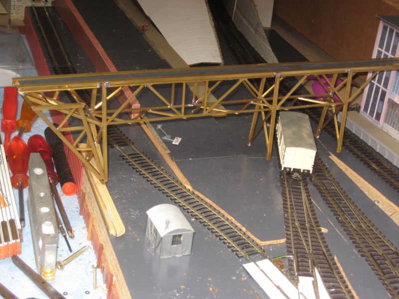 Die kleine Plattform vorne links ist für den Kran vorgesehen. Das "Förderband" selbst ist 4mm Kork (grau angemalt), der in die 6mm-H-Träger eingeschoben worden ist.