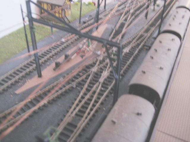 Ein recht helles Photo der S-Bahn-Anlage: vorn links zu Bahnsteiggleis 1, vorn rechts zu Bahnsteiggleis 2 - hinten rechts das Streckengleis und hinten links zwei Abstellgleise (hinter dem "Hosenträger"). Man kann von jedem Bahnsteiggleis die anderen drei Gleise erreichen.