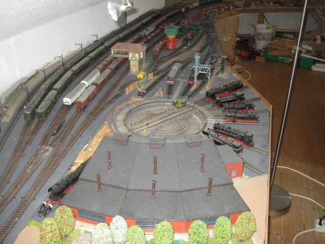 Prinzipiell ist mein Kopfbahnhof ähnlich wie Deine Planung, nur dass Abstellgruppe und Bahnbetriebswerk nebeneinander liegen. Aber die Dimensionen sind kleiner: nur 4 Bahnsteiggleise, eingleisige Hauptstrecke, Lokschuppen nur 3 Stände
