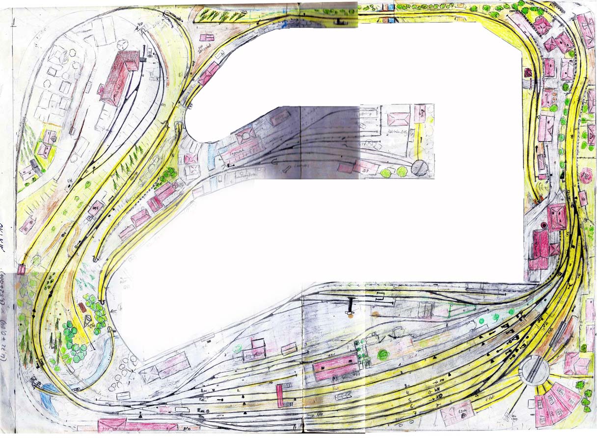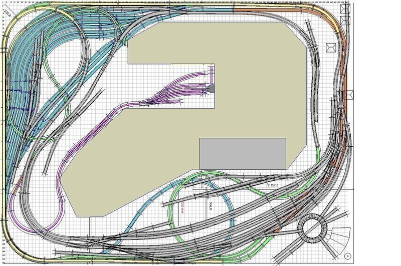 Hier mal ein Plan - sieht auf den ersten Blick etwas komplex aus, aber da die Tiefe der Anlage nur 1,20m maximal ist und es bei langen Zügen von 2,5m zu Absturzrisiken bei nur 50cm Radius kommt musste ich eine "grosse Wendel" an der Wand entlang bauen. Daher liegen insgesamt maximal 5 Ebenen übereinander - ohne ein Programm wie z.B. Winrail (aus dem ist auch der Auszug unten) - hätte ich es wohl nie hingekriegt genau immer die Steigung von 2,5 % einzuhalten...