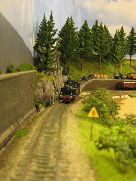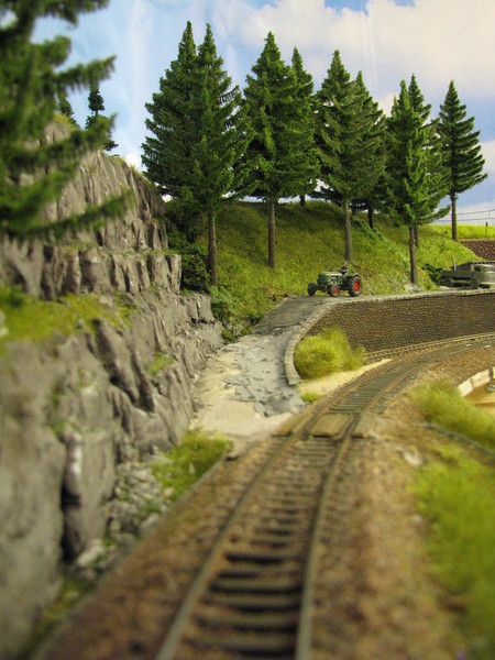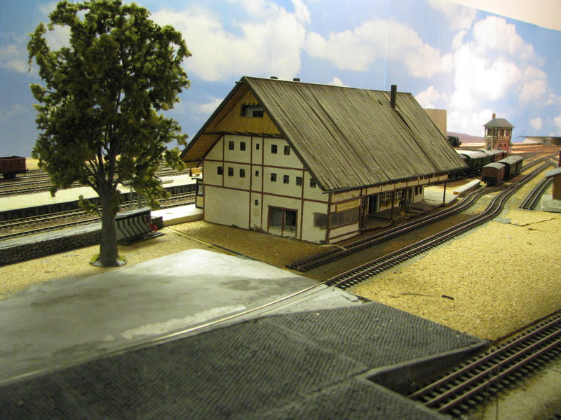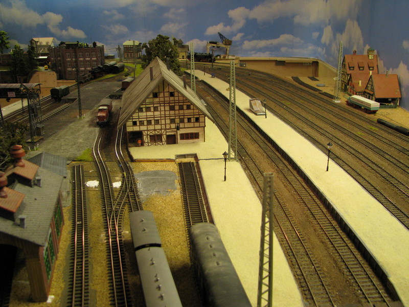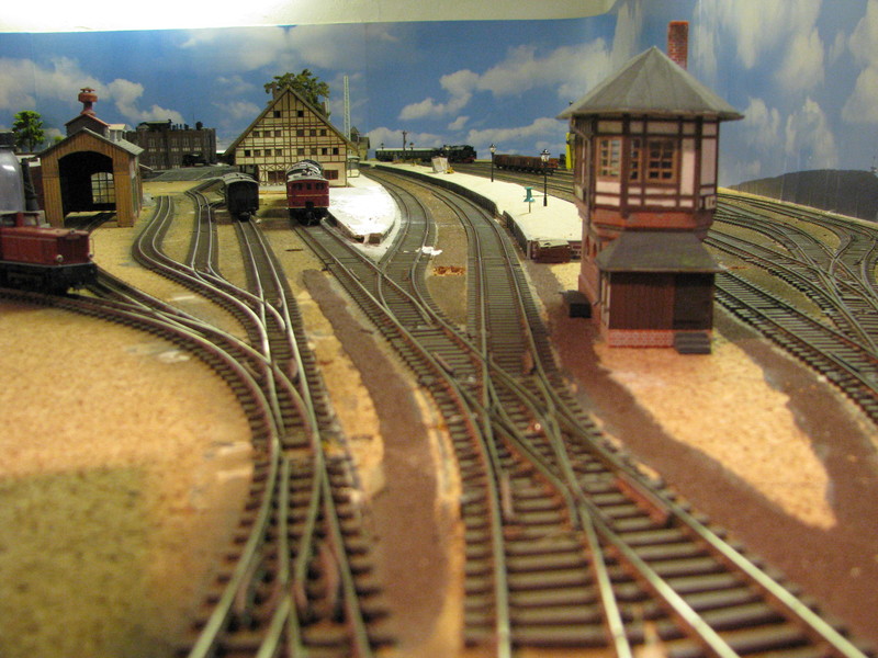 Ausser dem Bahnhof liegt alles im Gefälle - Die Strecke nach Titisee steigt, die nach Waldshut und Konstanz fällt. Entsprechend schwierig war die Planung weil der Bahnhof sich in die Landschaft einbetten sollte. Ausserdem lege ich viel Wert auf Rangiermöglichkeiten. Auch wenn es nur einen H0/H0e kombinierten Bahnhof gibt sind die Möglichkeiten doch ziemlich vielfältig.