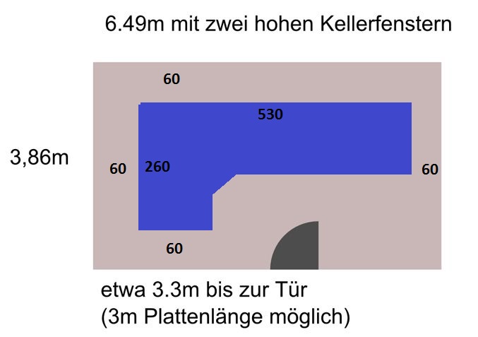 mein Name ist Wolfgang und ich wohne im schönen Großraum München. Im Sommer wird es nun entlich so weit sein und wir ziehen in eine größere Immobilie wo ich meinen eigenen Modellbahnkeller erhalten werde. Der Keller hat die Maße 6.49m x 3.86m die Eingangstür ist etwa 3.3m von der Wand entfernt und auf der gegenüberliegenden Seite sind zwei Kellerfenster (hohe Fenster) die die Plattenbreite ein wenig einschrenken werden (1m max).