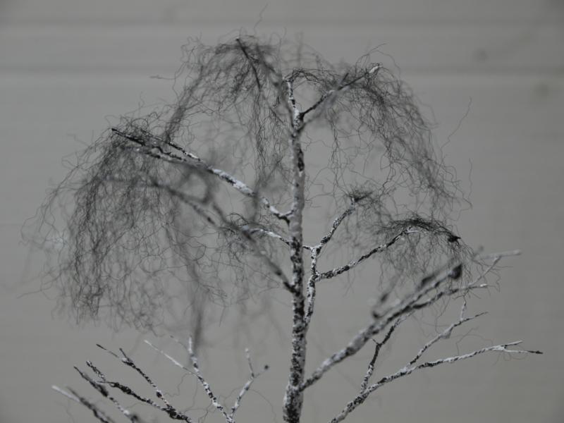 Die Faser wird aufgelockert so daß es viele einzelne Fasern sind und diese werden in kleinste fast nicht sichbare Streifen an den Ästen der Birke drangehängt