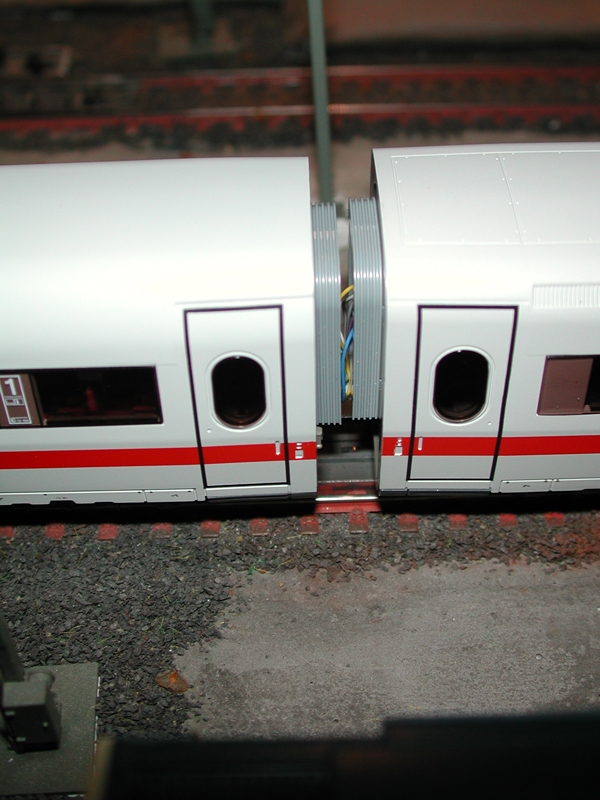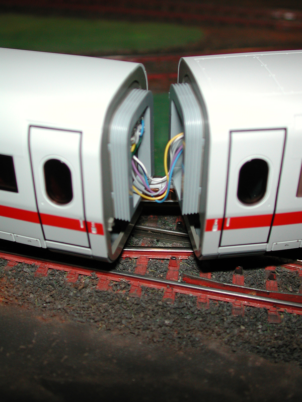 Erst dann werden die Kupplungen zusammengesteckt. Es ergibt sich dann bei gerader Fahrt ein sehr schönes Zugbild. Die Kabel fallen kaum auf.