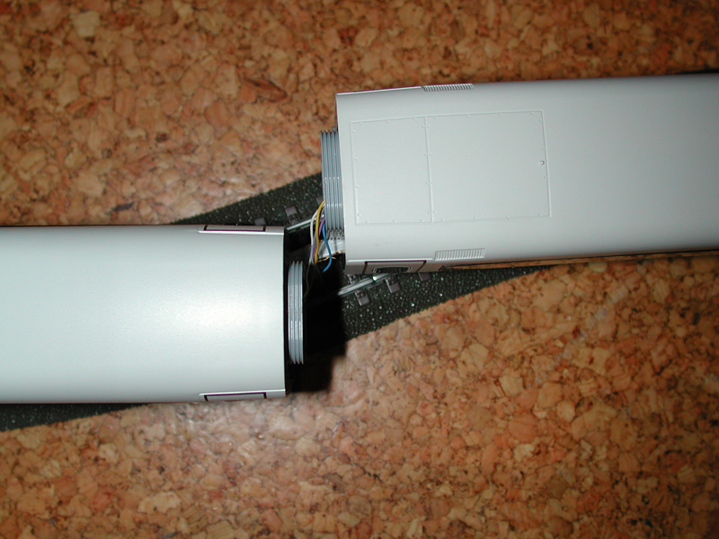 Als erste muß auf der Buchsenseite des Wagens der Faltenbalg abgenommen werden, damit der Stecker des zu kuppelnden Wagens leichter in die 8-polige Buchse eingesteckt werden kann. Die Kabel zeigen dabei nach unten hin. Der Faltenbalg wird natürlich vorher über das Kabel gesteckt, damit er anschließend wieder montiert werden kann.