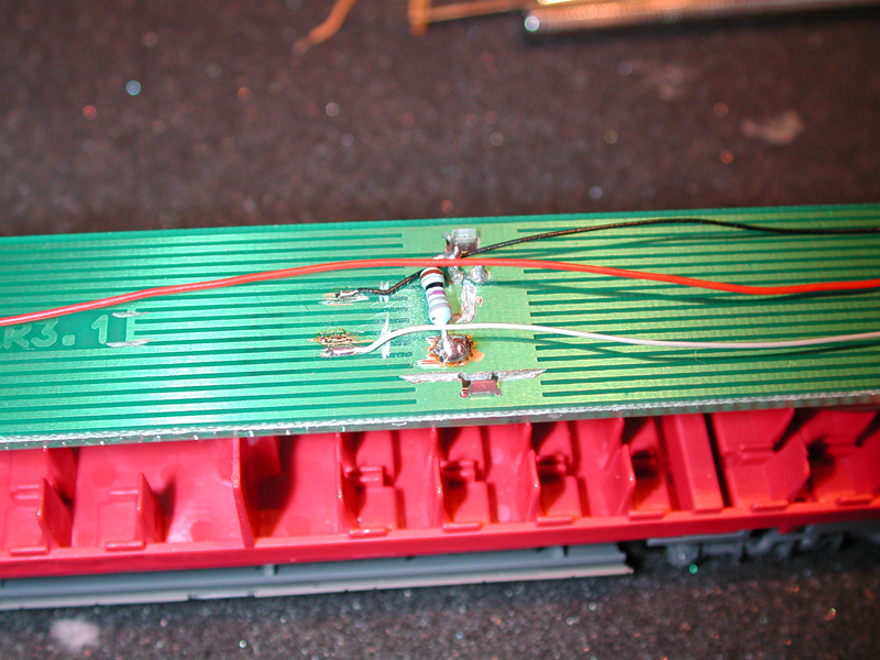 Die Leiterplatten für die Innenbeleuchtung der Zwischenwagen habe ich umgebaut für die Verwendung von LEDs. Dafür habe ich die Leiterbahnen entsprechend aufgetrennt und passende Vorwiderstände eingebaut. Als LEDs habe ich SMD-LED Kaltweiss verwendet. Zwei Stück anstelle einer Glühbirne. Zuerst habe ich bei beiden LEDs jeweils einen Drahtrest vom Vorwiderstand an den einen Pol der LED gelötet, diese dann in den einen Pol der Platine gesteckt und so ausgerichtet, dass die LED zum Lichtleiter abstrahlt. Die beiden freien Pole der LEDs habe ich dann mit einem weiteren kurzen Draht verbunden. Dadurch sind die LEDs passgenau für dir Lampensteckfassungen einsteckbar.