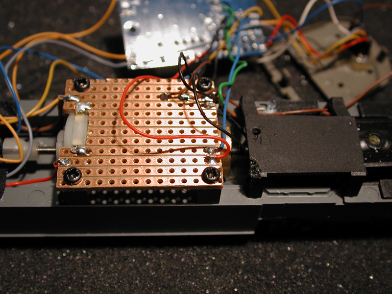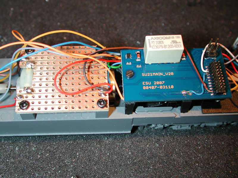 An die Stelle des alten Decoders habe ich ein Stück Streifenplatine montiert mit einem passenden Ausschnitt für die Motoranschlüsse. Rechts neben dem Motor ist schon die Halterung Multisound, die dann die Schleiferumschaltung von ESU mitsamt dem Loksounddecoder tragen darf. An dieser Halterung habe ich für die Kabel vorne links etwas Material abgenommen.