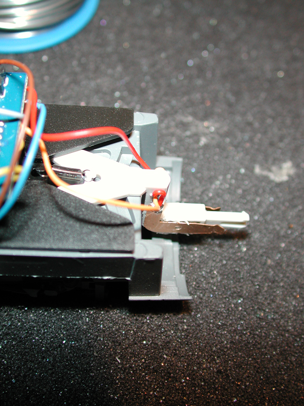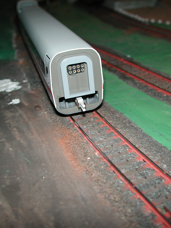 Deswegen habe ich mir doch noch die zweipoligen Kupplungen von Märklin besorgt. Da es die Kupplung vom Triebkopf leider nicht in zweipoliger Version gibt, habe ich von einer Zwischenwagenkupplung die Kontaktbleche abgenommen und mit Heißkleber an die Kupplung des Triebkopfes geklebt. Die Kabel habe ich, damit die Klebestellen nicht zu sehr belastet werden, durch kleine Bohrungen in der Kupplung jeweils einmal auf die andere Seite geführt. Die beiden Pole der Kupplung habe ich zum einen für die Verbindung zum Schleifer des Steuerwagens und zum zweiten für den gemeinsamen Funktionsrückleiter genutzt, da das die beiden Pole mit der größten Stromstärke sind. Die Masse des Zuges kommt ja im Normalfall direkt vom Triebkopf und die Leitung durch den Zug ist wohl eher Kosmetik.