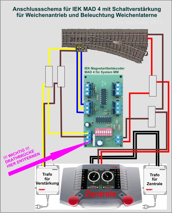 braun+rot (Trafo der Zentrale) = steuerstrom für decoder braun+rot (Trafo der Zentrale) = fahrstrom auf das Gleis braun+gelb Trafo für die ext. Versorgung der Decoder) = schaltstrom für magnetartikel