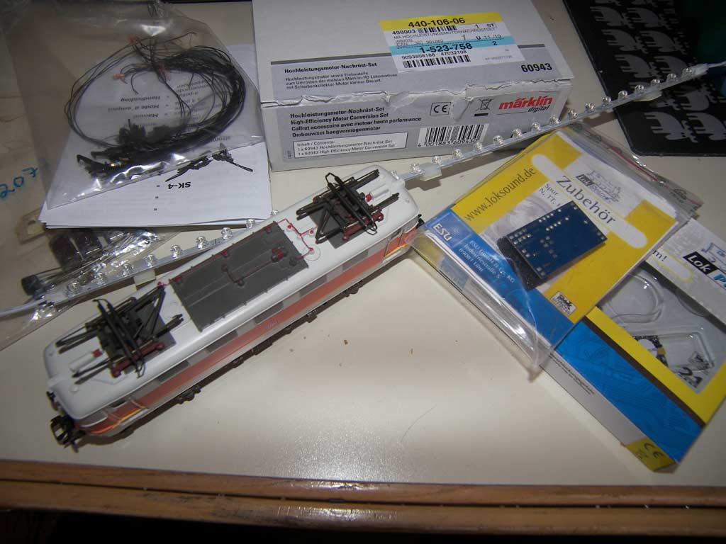 Folgende Teile liegen bereit: Märklin 60943 als Motor [EDIT: Hier habe ich Lehrgeld gezahlt. Es ist das falsche Set!] ESU Schleiferumschaltung ESU Lopi 4 TAMS SK-4 Elektronikbauteile für einen Test der Innenbeleuchtung und Abschalten der Schleiferumschaltung. Ein Relais zum Schalten der Innenbeleuchtung fehlt noch. Ich gehe aber davon aus, dass ich nicht so weit komme dieses Wochenende. Von daher unkritisch.