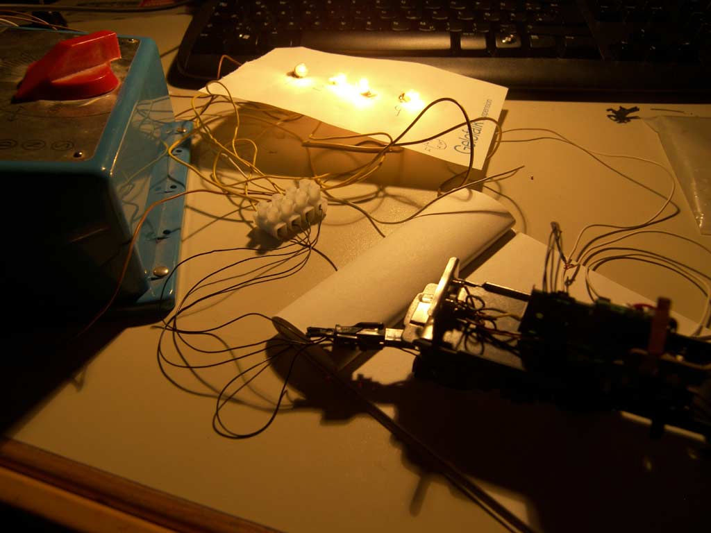 Naja zum Umschalter: Die Vermutung mit der Ober- und Schleiferumschaltung ist gut aber diese befindet sich unter dem Zug. Ich habe sie nicht angerührt, so dass theoretisch immer noch mit Oberleitung gefahren werden kann. Diesen Hebel nutze ich nun aber als "Totschaltung". Denn es kann mal vorkommen, dass ich die Lok einfach ohne Funktion abstellen will. Der Umschalter in der Lok ist in der Schaltung am Anfang des Threads auch vermerkt. Er schaltet die Schleiferumschaltung de Facto ab, da er den hinteren Schleifer ab und den Strom vom Lokschalter umschalten kann. Gleichzeitig liegt am zweiten UM des Schalters auch die Masse der rückwärtigen Beleuchtung an. Sollte ich es wollen, kann ich die Lokomtive mit einem Klick auf Normalbetrieb zurücksetzen.