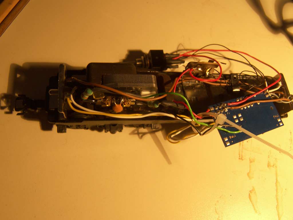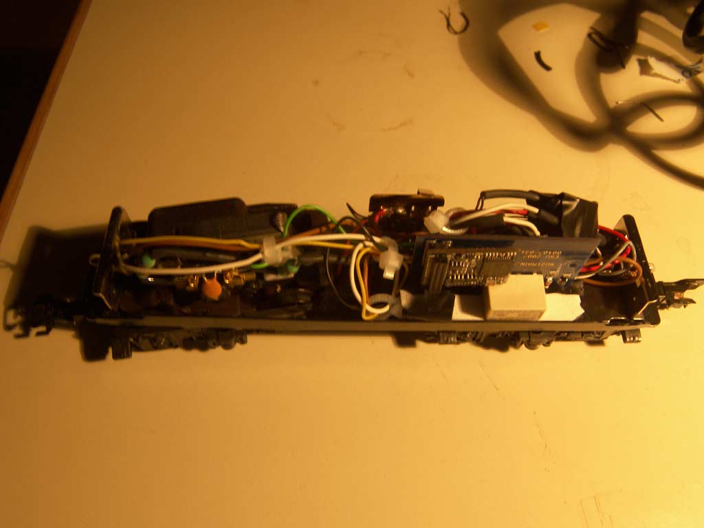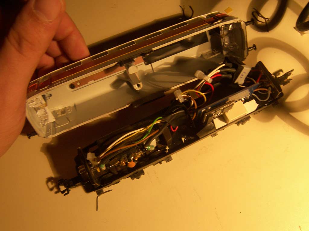 Die Lok ist relativ einfach umzurüsten, wenn man wie ich auf einen r/w-Wechsel verzichtet und die Glübirnen beibeihält. Lediglich im Innenraum ist mit beschränkten Platzverhältnissen zu rechnen. Die Masse wird an den Glühbirnen sockeln wie im Ursprungszustand abgenommen.