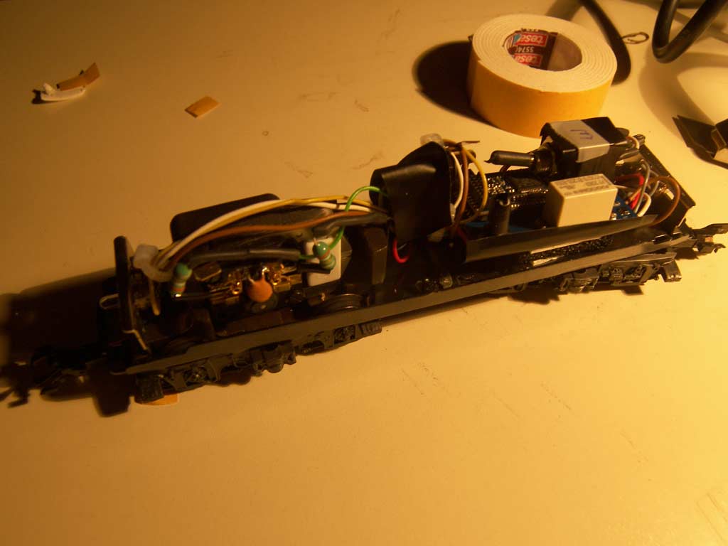 Nur eine komplette Neuanordnung schaffte endlich Abhilfe der Situation. Um die Kabel unter dem Decoder duchzuziehen habe ich einen Abstandshalter aus dem Klebeband und dem Schaumstoff der Verpackung des Schleiferumschalters gebaut. Der Schalter wurde auf die Platine des Schleiferumschalters geklebt und der erste Test mit dem Gehäuse klappte wunderbar. Nur auf der Anlage nicht: Lösung war hier der Decoder der sich auf der Schnittstelle bei den Umbauten gelockert hat.